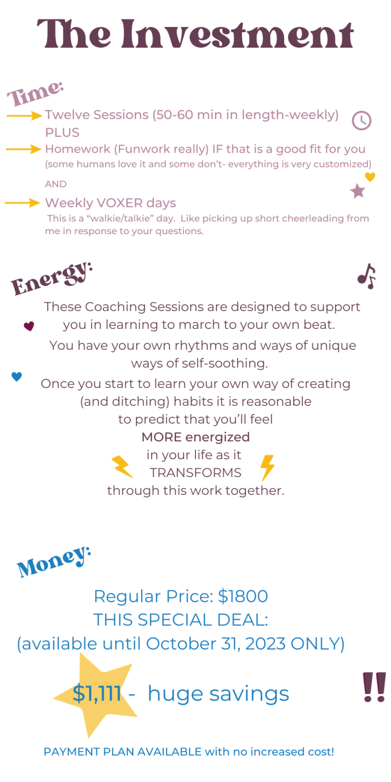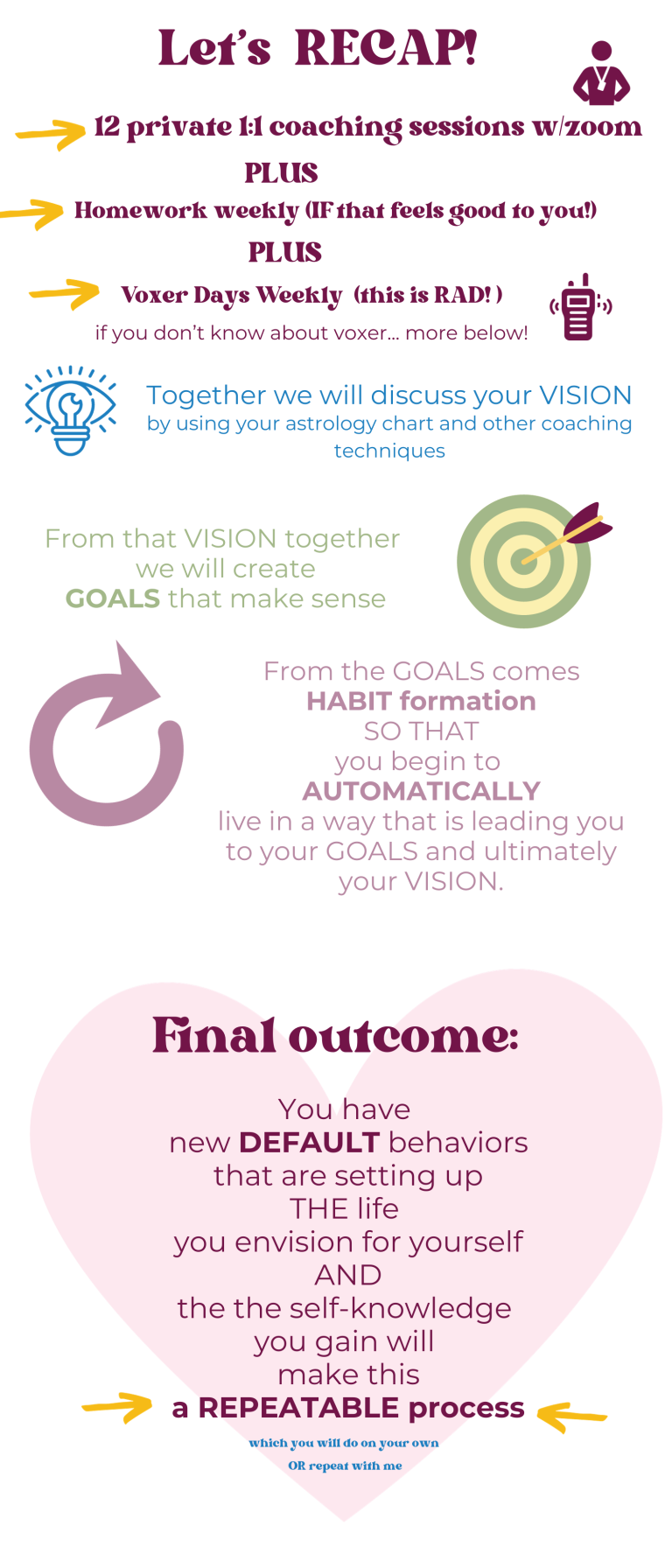 Our next coaching sessions together will be a combo of setting some goals (or intentions if that language feels better to you- again, one size does not fit all which is the POINT!)