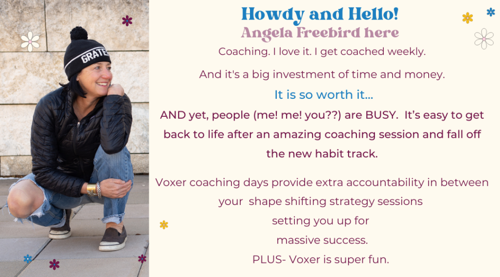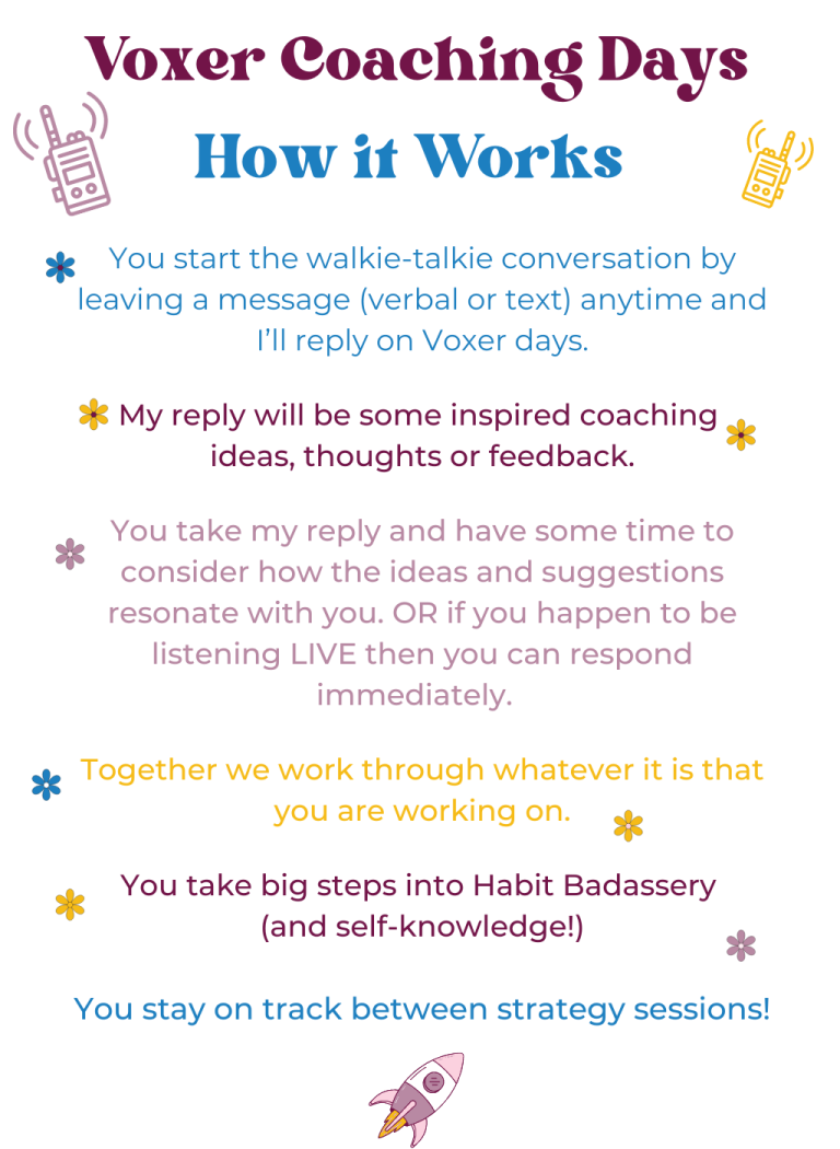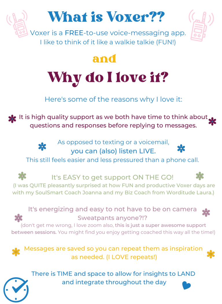 You can send your Voxer messages anytime.  I’ll be replying on Voxer Days (Tuesdays and Fridays).  IF you really need me, you can send an email and we’ll do an SOS voxer- no problem.